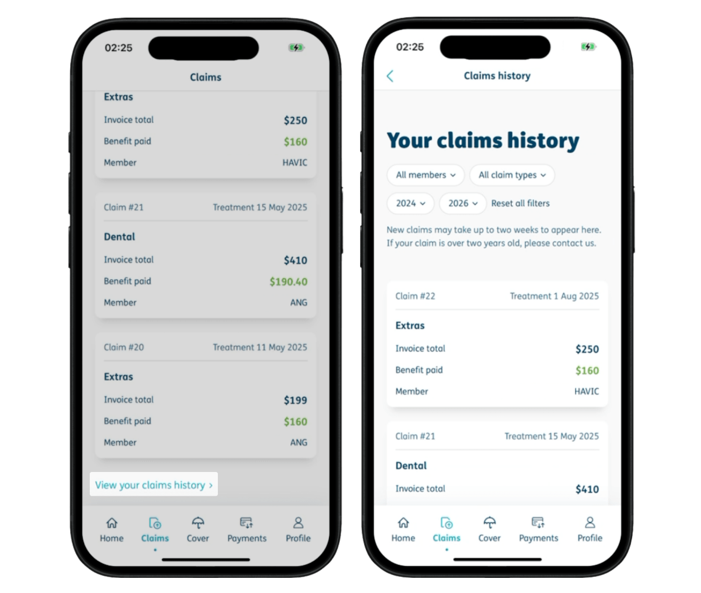 Scroll to the bottom and tap on the ‘View your claims history’ link. Use the filters to show your past benefit and claims history by calendar year, claim type or member on your policy.